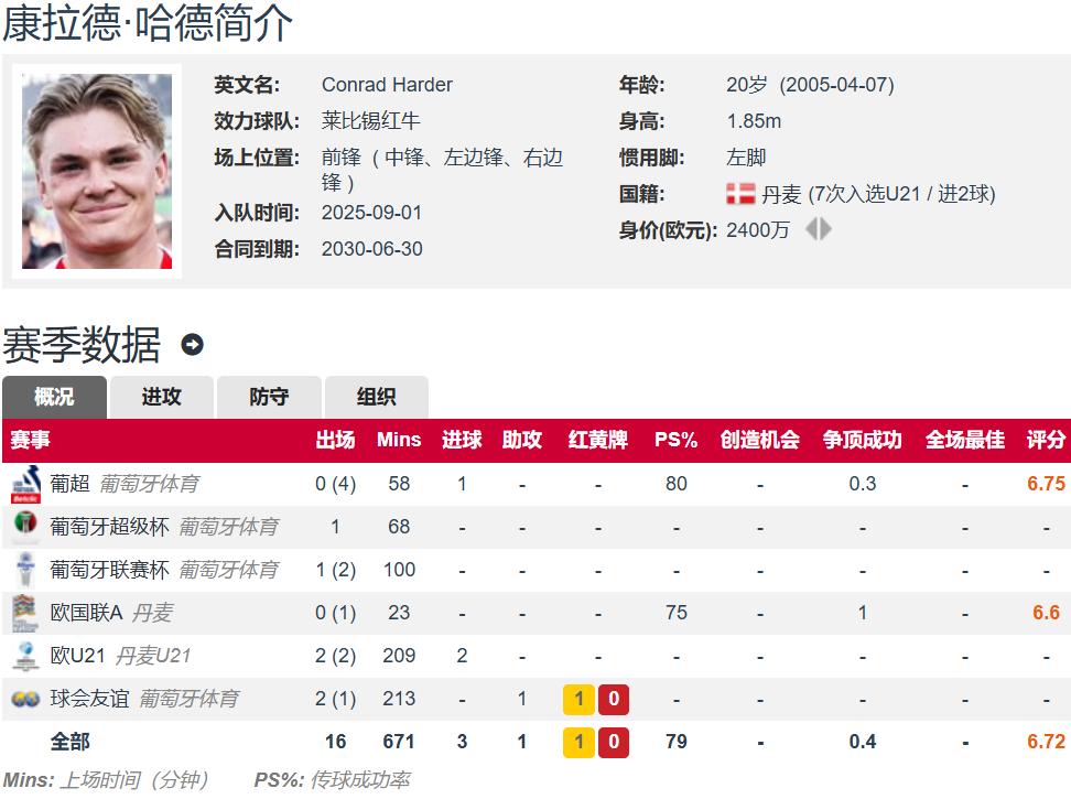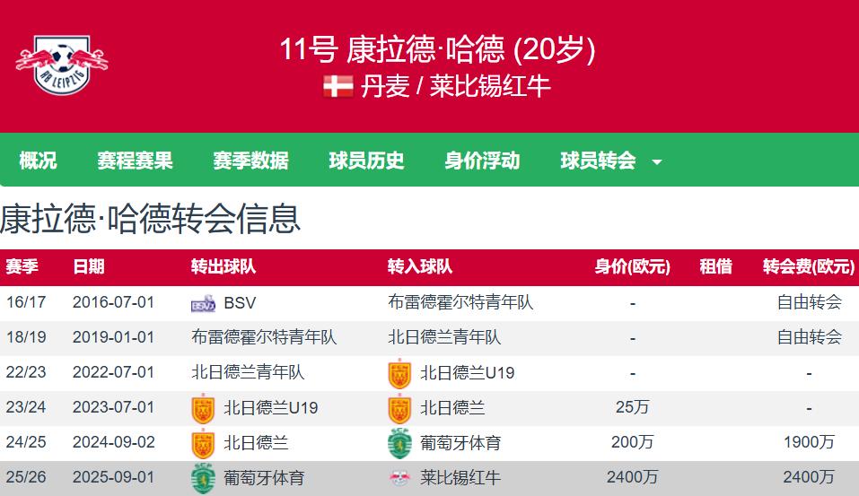 根据德转的数据,20岁的丹麦前锋哈德尔于9月1日以2400万欧元的价格从葡萄牙体育转会至莱比锡。这名丹麦射手将身披11号球衣,接替加盟尤文图斯的奥蓬达离开后留下的位置。