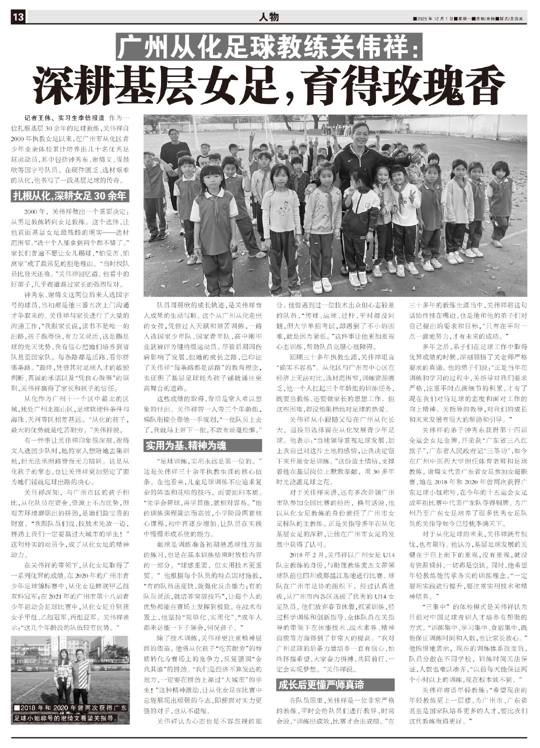 队员周晨欣的成长轨迹,生动展现了关伟祥的育人成果。这个来自广州从化的女孩,凭借出众天赋和刻苦训练,先后入选国家少年队和青年队,高中毕业时被评为健将级运动员。尽管后来因伤病影响发展,但她的成长经历验证了关伟祥“每条路都是活路”的理念,也证明基层足球能为孩子们铺就通向更高舞台的道路。