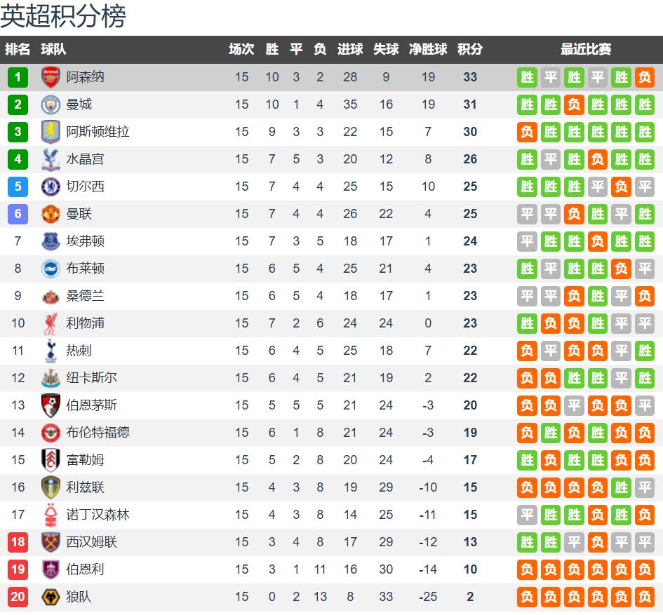 第一点:双方情况!英超15轮结束,阿森纳取得10胜3平2负,积33分稳居榜首,狼队仅有2平13负积2分排名最末。上轮联赛,阿森纳客场0-1负于阿斯顿维拉,领先优势缩小到2分,各项赛事18场不败纪录告破,周中欧冠大轮换仍以3-0客胜布鲁日;狼队主场1-4不敌曼联,遭遇联赛8连败,15轮仅积2分,降级几成定局。