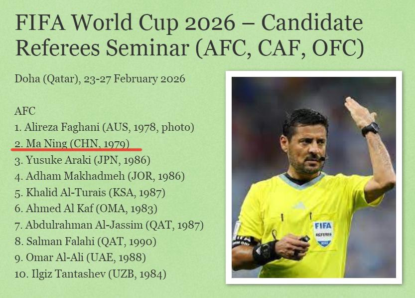 去年2月,Refereeing World披露,亚足联有12个会员协会的16名裁判(含1名女裁判)入选2026年世界杯执法候选名单,马宁名列其中。